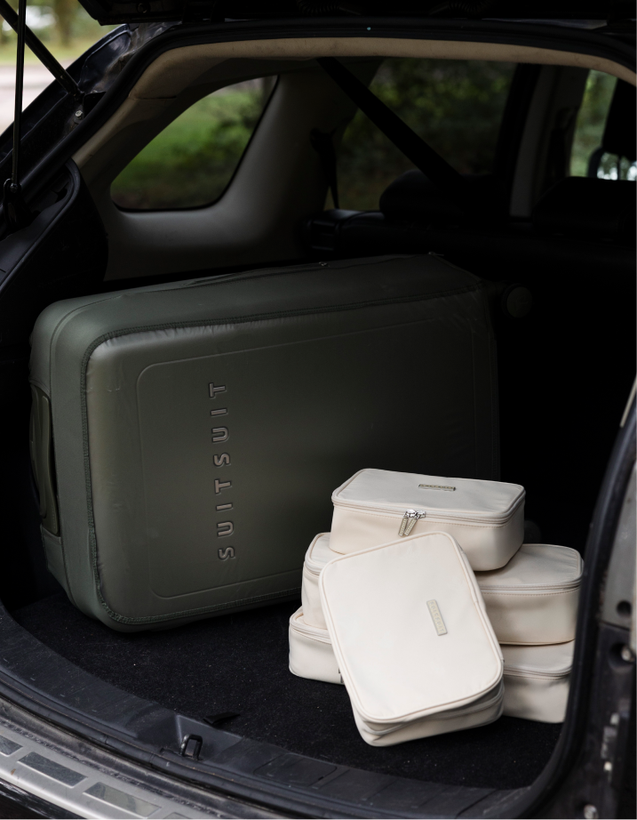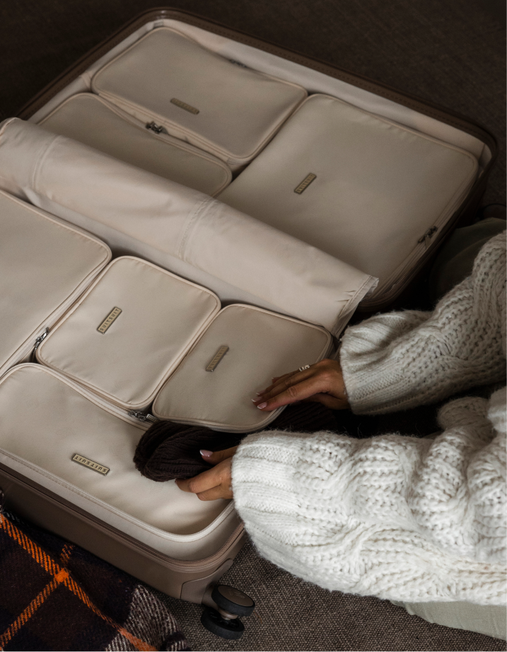 The ultimate travel set: shop now with a 20% discount and receive a suitcase, a protection cover, and a packing cubes set.