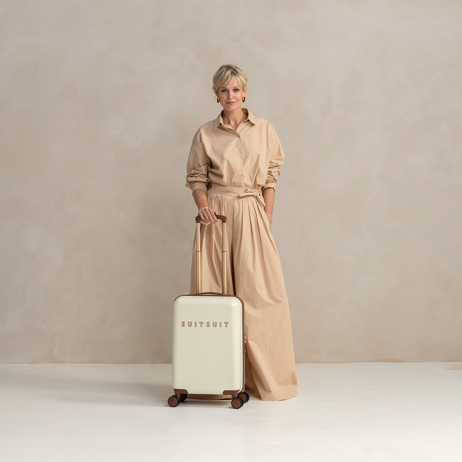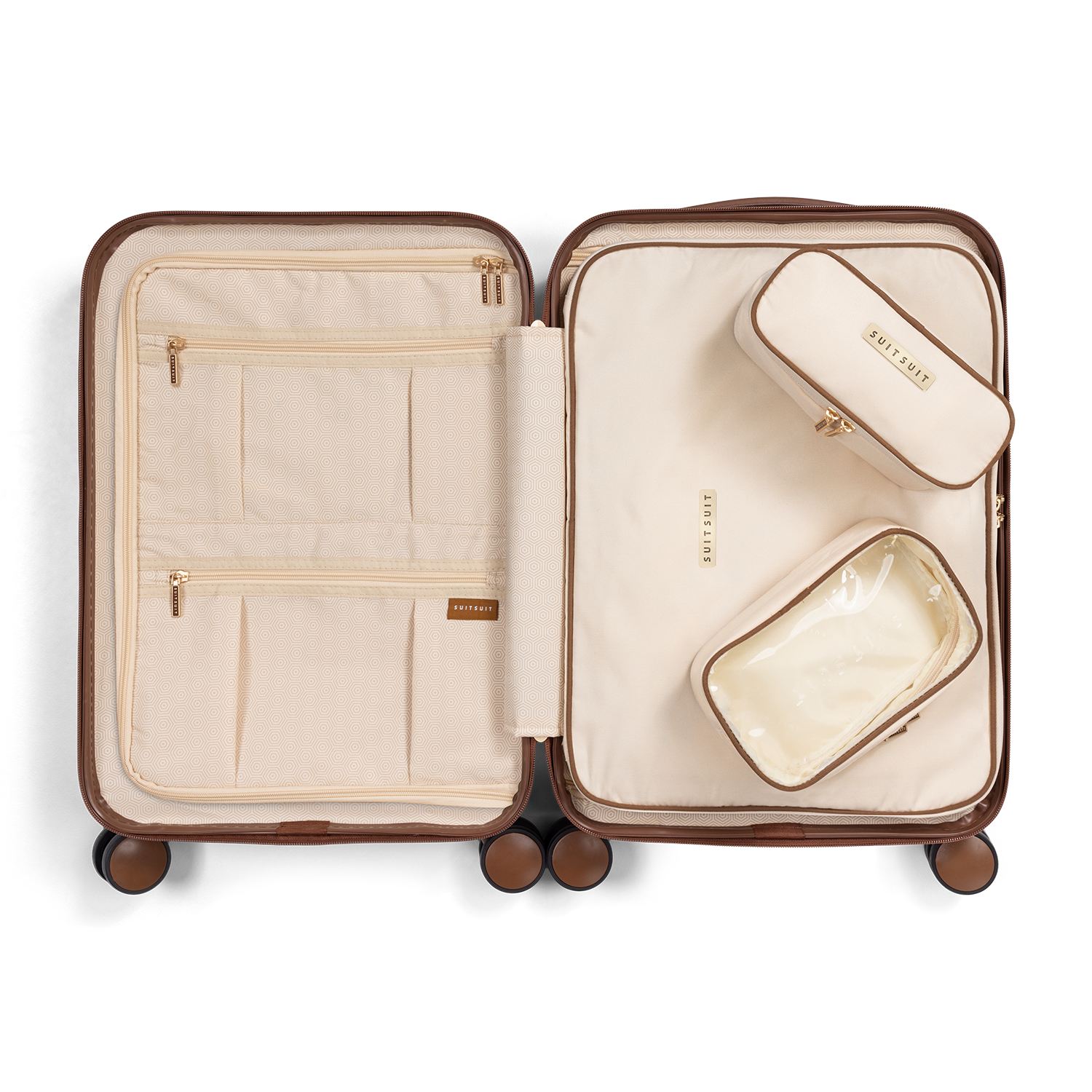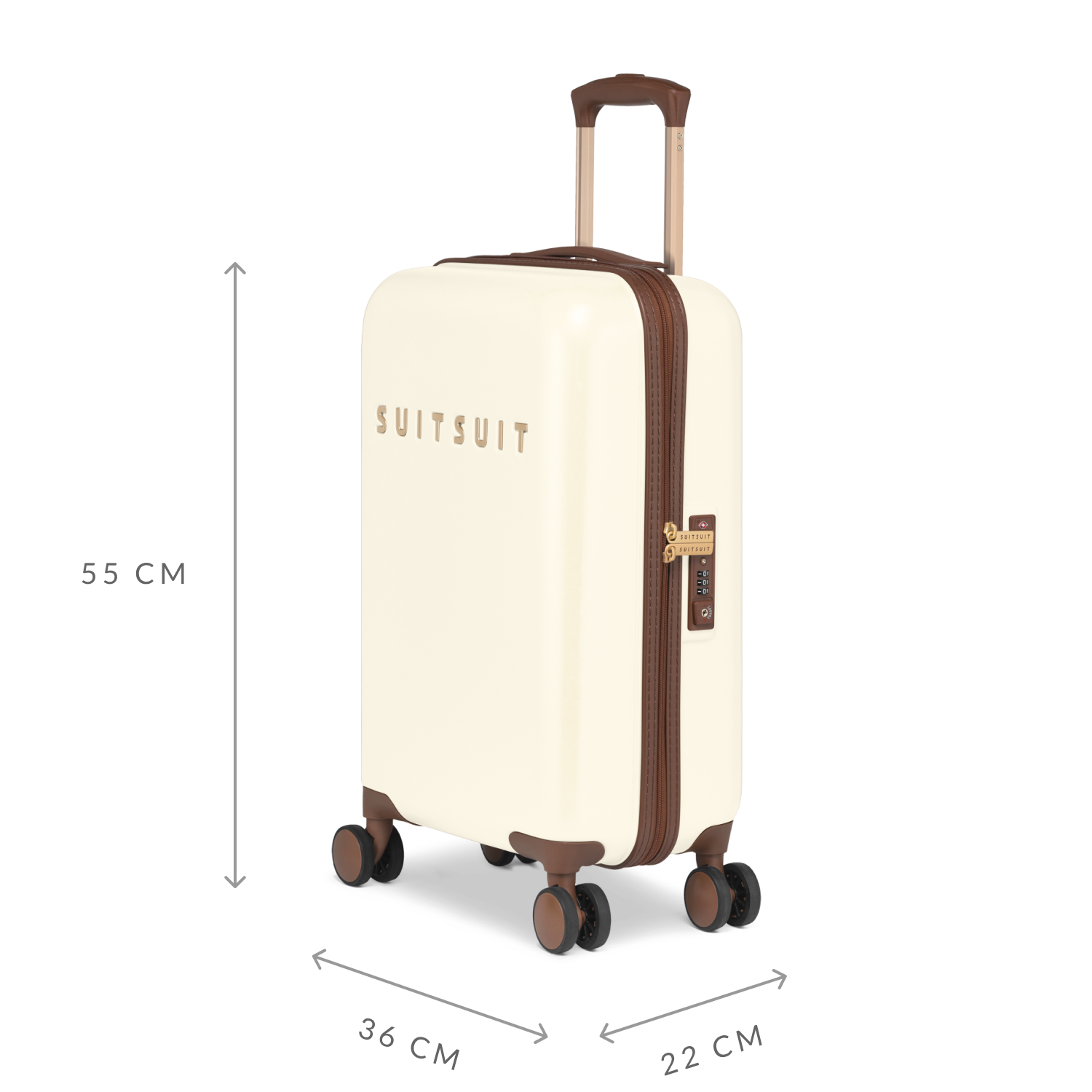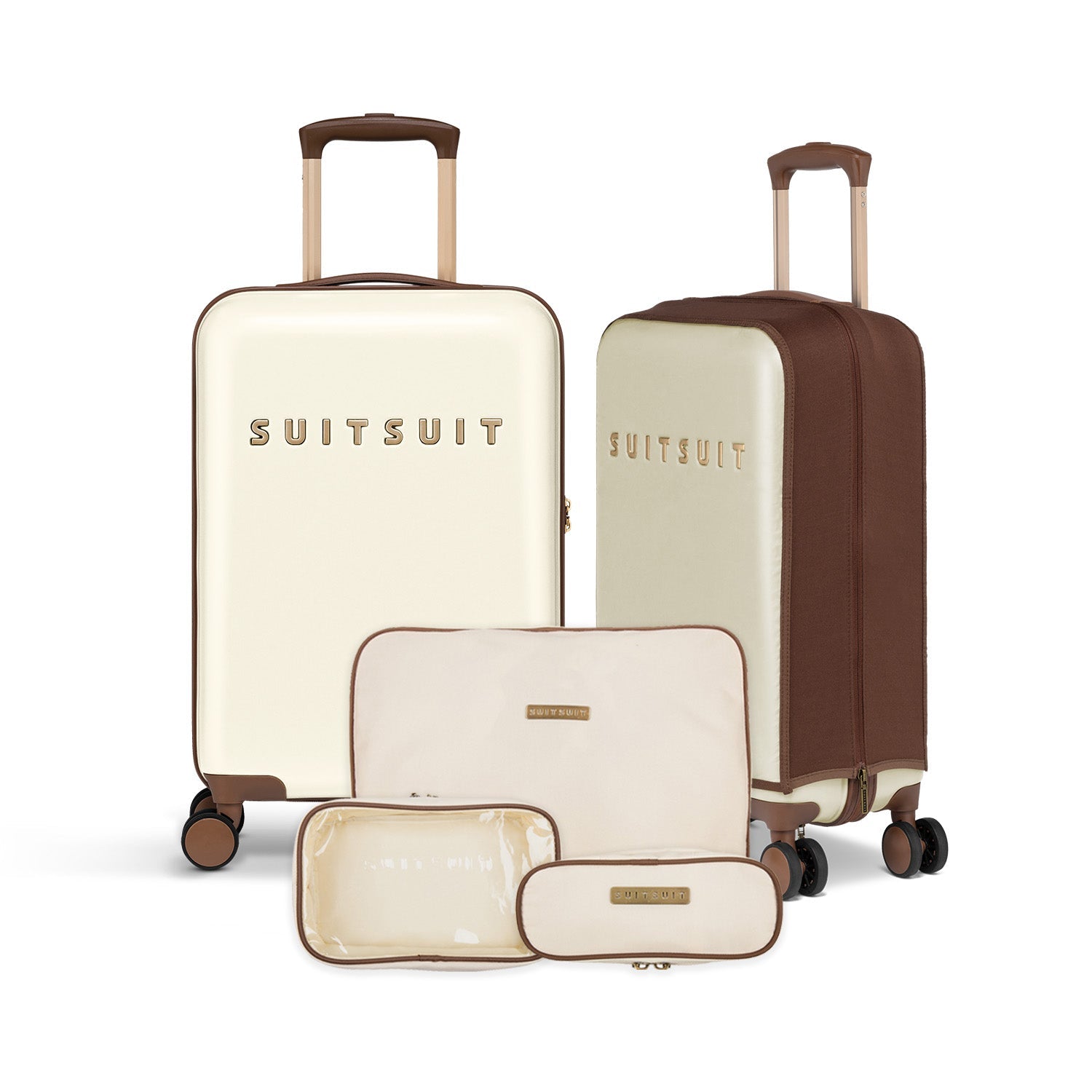 - Cet ensemble comprend le Antique White Cabine valise (20 pouces), le Burned Caramel Housse de Protection (20 pouces), et le Antique White Set de Organisateurs (20 pouces).