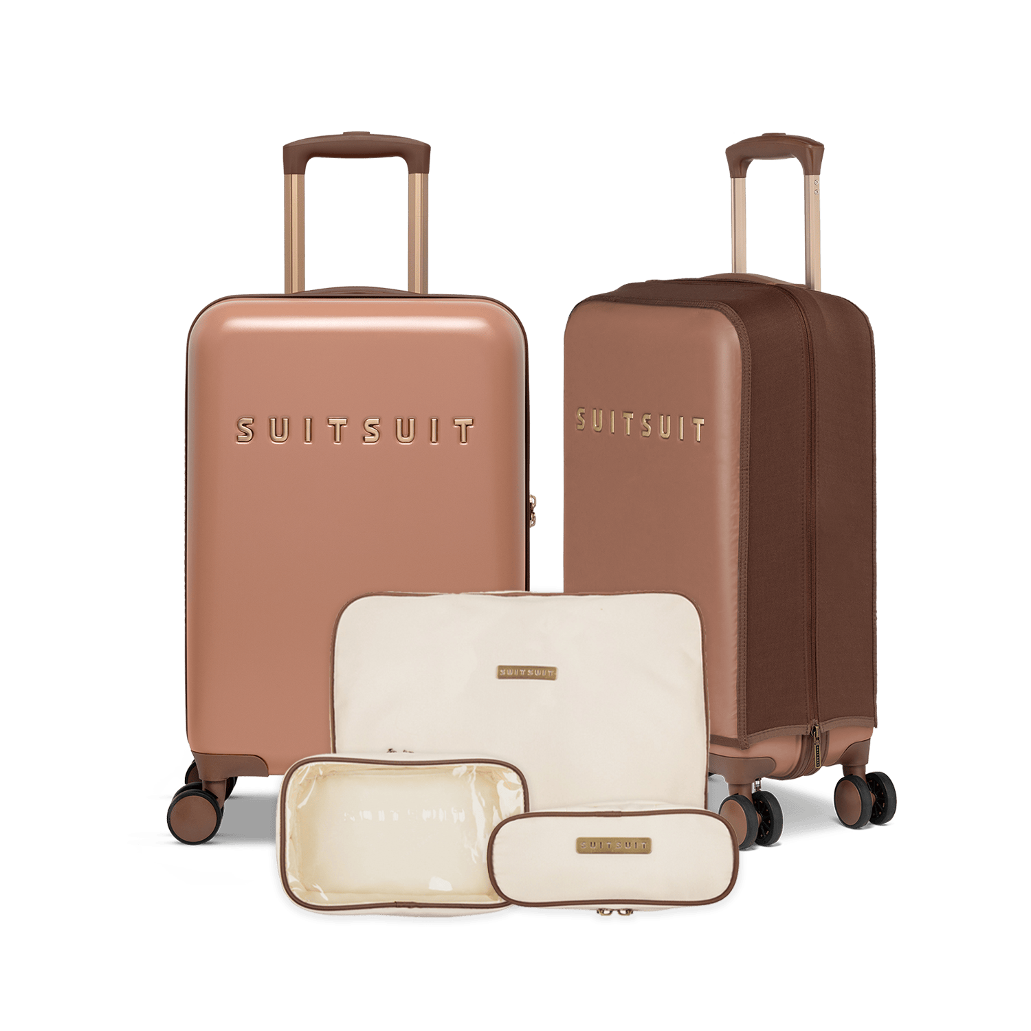 - This set contains the Italian Clay carry-on suitcase (55 CM), the Burned Caramel protection cover (55 CM) and the Antique White packing cube set (55 CM).