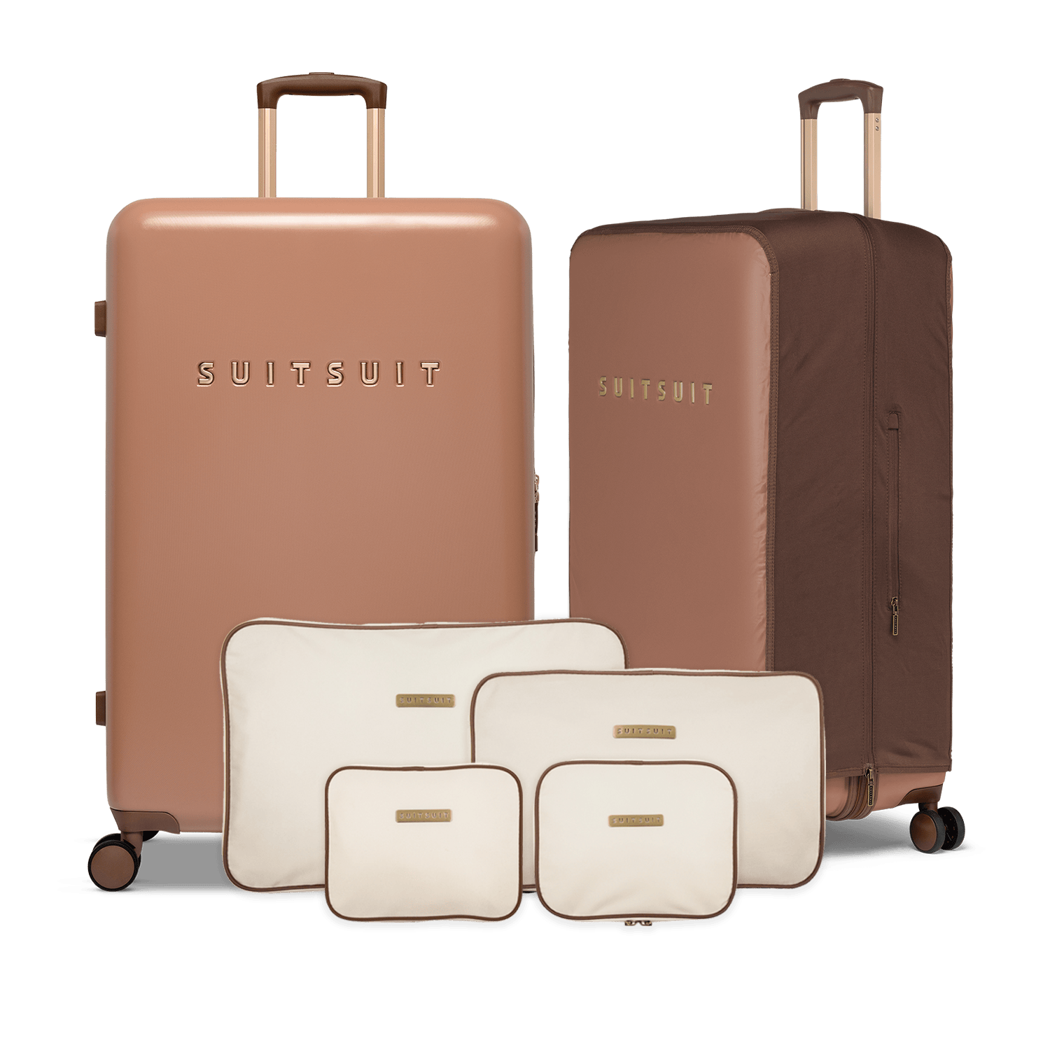 - This set contains the Italian Clay check-in suitcase (76 CM), the Burned Caramel protection cover (76 CM) and the Antique White packing cube set (76 CM).