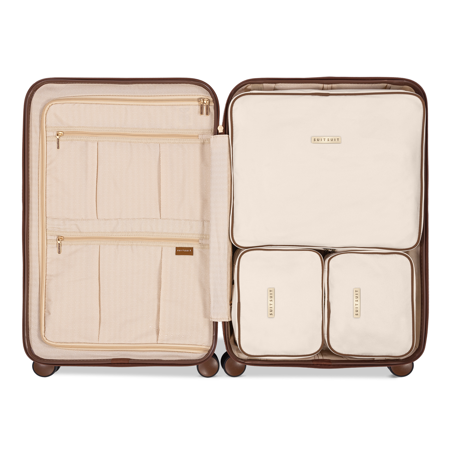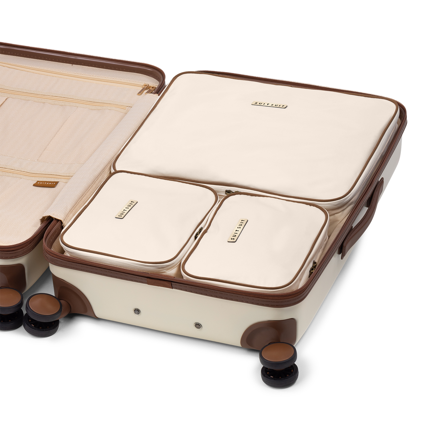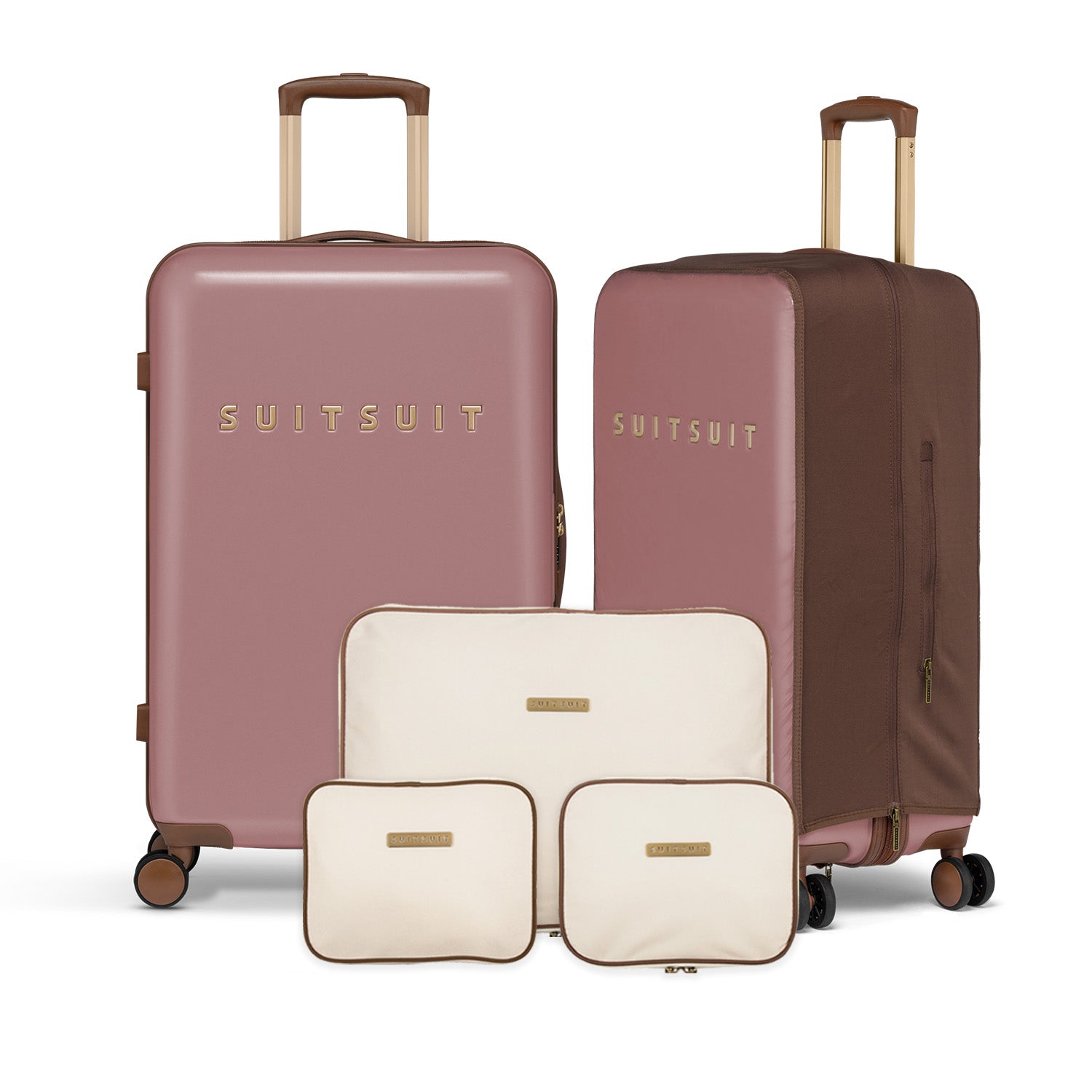 - Cet ensemble comprend le Old Rose valise (24 pouces), le Burned Caramel Housse de Protection (24 pouces), et le Antique White Set de Organisateurs (24 pouces).