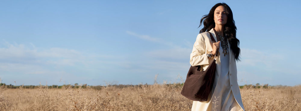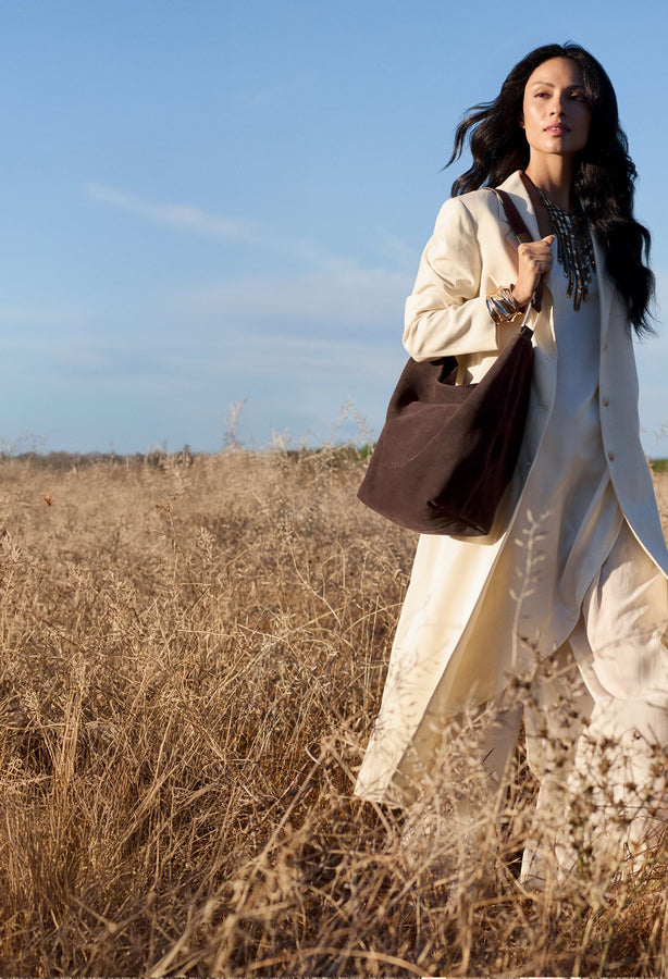 Soft shapes, rich suede, and subtle rose-gold accents come together in the new Fab Seventies suede bags. Handcrafted from supple suede cow leather and lined with recycled jacquard, they combine timeless design with modern elegance.