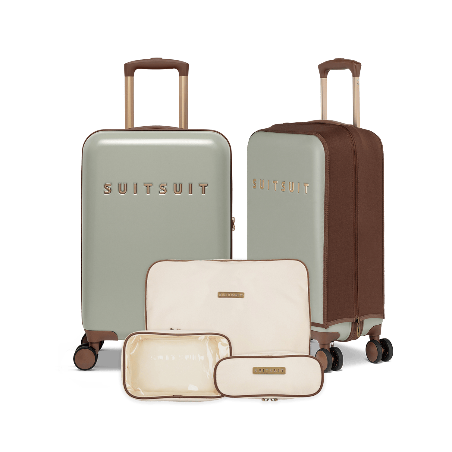 - This set contains the Sustained Grey carry-on suitcase (55 CM), the Burned Caramel protection cover (55 CM) and the Antique White packing cube set (55 CM).