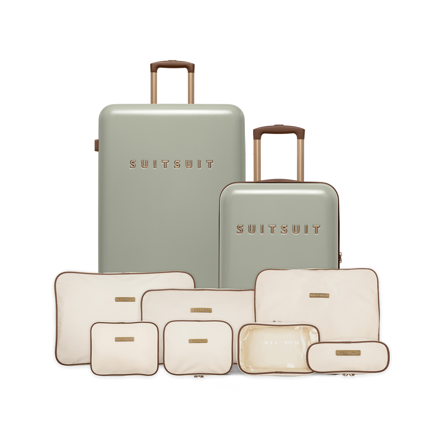 • This set includes the Sustained Grey suitcase (76 CM), the Sustained Grey carry-on suitcase (55 CM), and two Antique White packing cube sets (55 CM and 76 CM).