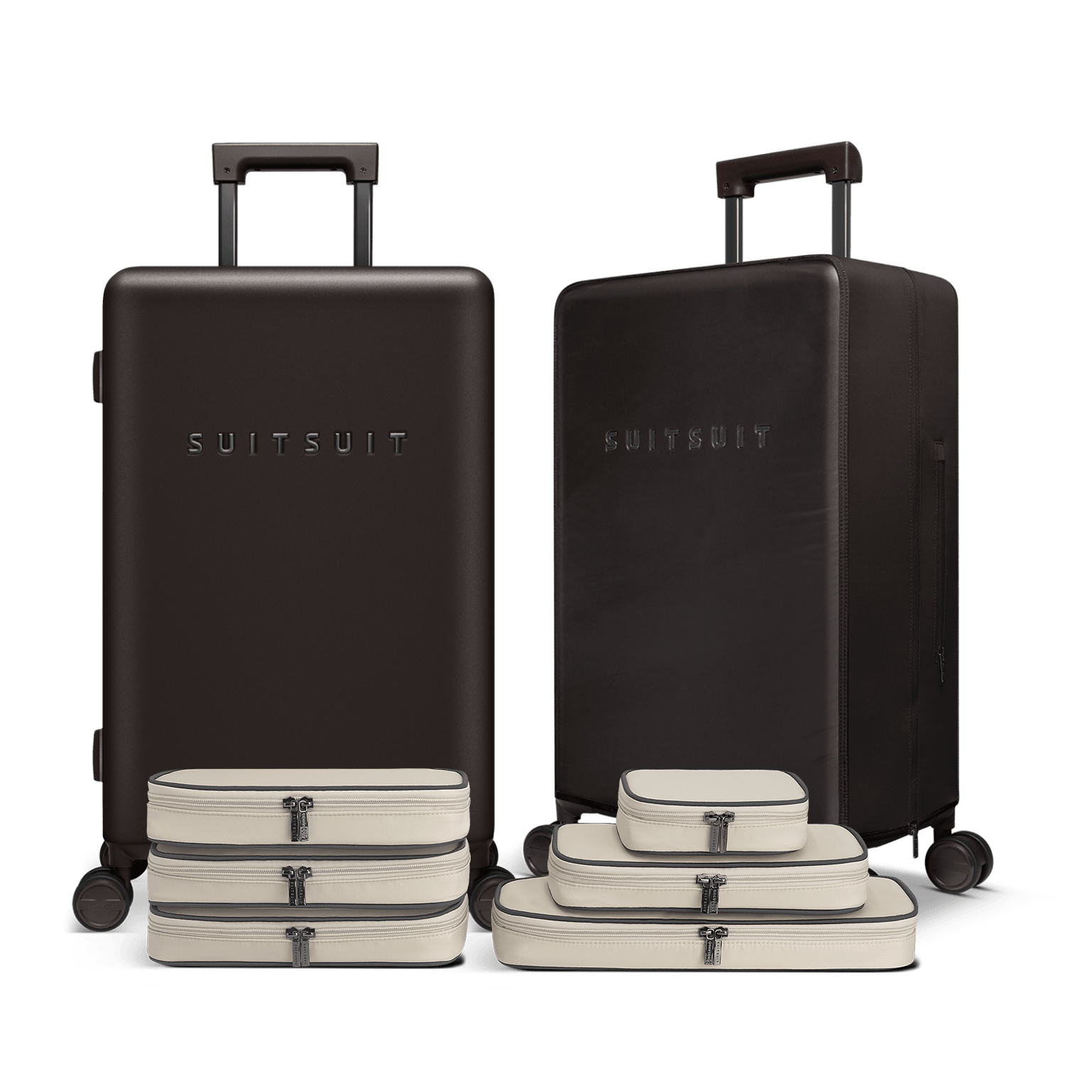 - This set contains the Ground Coffee check-in suitcase (66 CM), the Ground Coffee protection cover (66 CM) and the Faded Sand packing cube set (66 CM).
