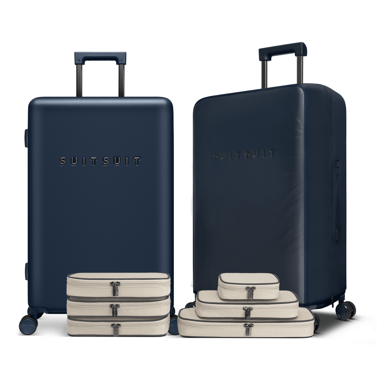 - This set contains the Midnight Blue check-in suitcase (76 CM), the Midnight Blue protection cover (76 CM) and the Faded Sand packing cube set (76 CM).